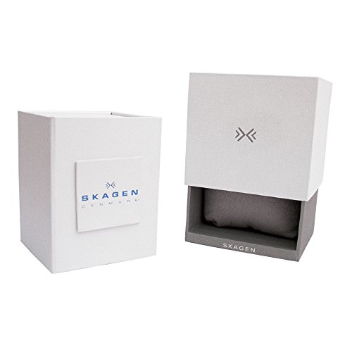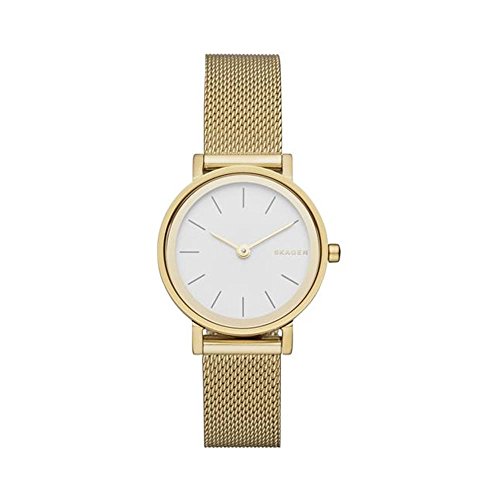 Stainless steel case. Steel mesh band with adjustable closure. Round face. Three-hand analog display with quartz movement. Dial features gold-tone hands, black hour markers, and Skagen detailing. Water resistant 3 ATM. Display case included.