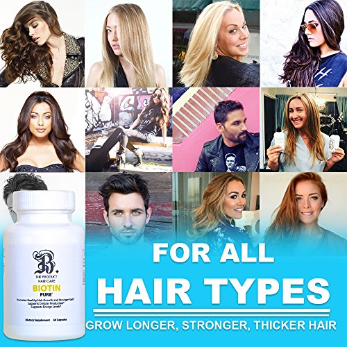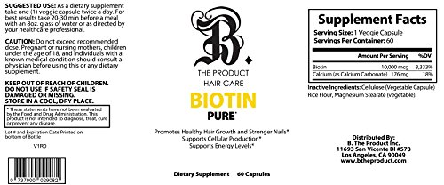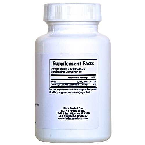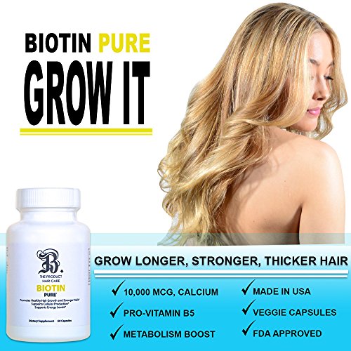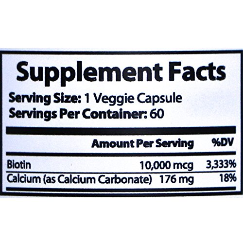PREVENT HAIR LOSS Take biotin daily to prevent premature hair loss and a receding hairline. It's scientifically formulated to support the growth of strong, healthy hair that remains intact during washing and brushing. Your Beard, eyelashes and eyebrows will also benefit! Biotin encourages natural hair regrowth for men and women and also revitalizes hair, helping those suffering from hair loss due to an illness and anyone with damaged hair. SKIN TREATMENT Add skin-nourishing biotin to your beauty routine and get clean, clear skin with improved elasticity. Your smooth, supple skin will have a radiant glow and a more youthful look. Our skin supplement also offers protection from acne, rashes and severe dryness. STRONGER NAILS Tired of your damaged nails? Strength your weak nails with our biotin vitamins so they're less susceptible to chipping and splitting. No more pain or frustration from yet another ruined manicure! METABOLISM BOOST A water soluble B vitamin, biotin works alongside enzymes that break down fats, carbohydrates and proteins and turn them into fuel for our bodies. Taking biotin speeds up this process and supplies you with a nice energy boost. ANTIOXIDANT RICH Our bodies naturally product free radicals, and we need antioxidants to neutralize and remove them from our bloodstream. But we need more than our own naturally occurring antioxidants, and that's where dietary supplements come into play. This biotin formula is supported by powerful antioxidants to repair cell damage and care for your hair, skin and nails from the inside out. No added sugar or artificial colors just pure, natural ingredients. We're cruelty free and GMP approved, too! - Made in the USA in an FDA Approved Facility - Biotin 10,000 mcg, Calcium (As Calcium Carbonate) - Veggie Capsules - B. The Product Biotin Hair Growth VitaminsFeature