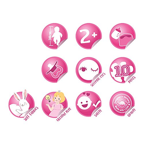 Inhalt: Spielpuppe Hartkorper 38 cm, Mutzchen, Top, kurze Hose, Schuhe, Latzchen, Windel, Schnuller mit Schnullerkette, Topfchen, Trinkflasche, Passport