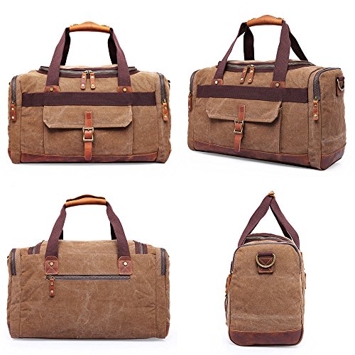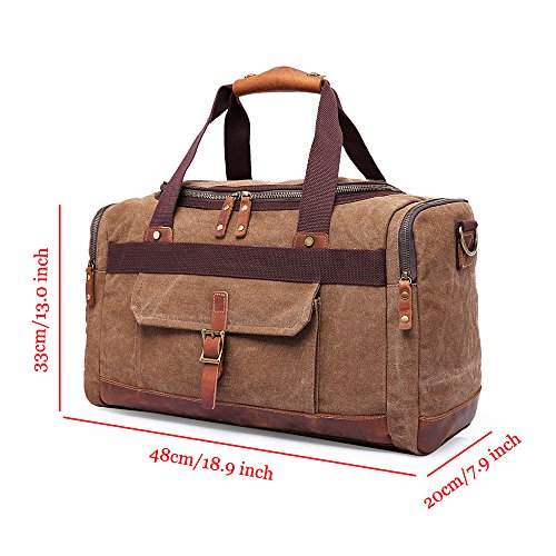-. Feature : Main material: 90% High quality canvas and 10% crazy horse Leather, it's a very durable travel bag. / Structure: Outside: 1 front pocket, 2 side zip pockets, 1 back zip pocket; Inside: 1 Main pocket, 2 pen pockets, 1 zip pocket, 2 phone pockets. / Dimension: 19.0"L x 7.9"W x 13.0"H (48cm x 20cm x 33cm, weight 1kg and capacity 30L. / Multi-purpose uses: this bag can be used as duffle/handbag/shoulder bag when travelling. It's very spacious and can hold your 15 inch laptop, camera, clothes, books and other stuffs. Large zip pulls and double zip design for the main pocket to makes it easy access. / Very good quality and perfect design makes it a special outdoor travel duffel for you.
