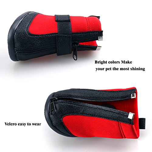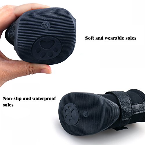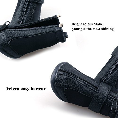 -. Feature : High Quality Material: Suede fabric inside could protect the claws and make pet fell comfortable. / Rugged: Tough anti-slip sole provides stability and traction, protection from sharp thorns, hot pavement, salt during winter. / Easily to Put On/Off: Front zipper, easy to wear. The shoes expand with a wide split seam opening and two adjustable and velcro straps to ensure a tight fit / How to Choose: Measure dog paw width for best fit. Refer the size chart with actual size of pet boots and choose the best suitable size for your Dog / 100% SATISFACTION GUARANTEE - Any questions, please let us know, we always try to give you our best service.