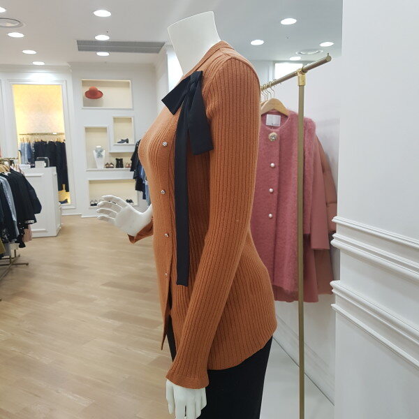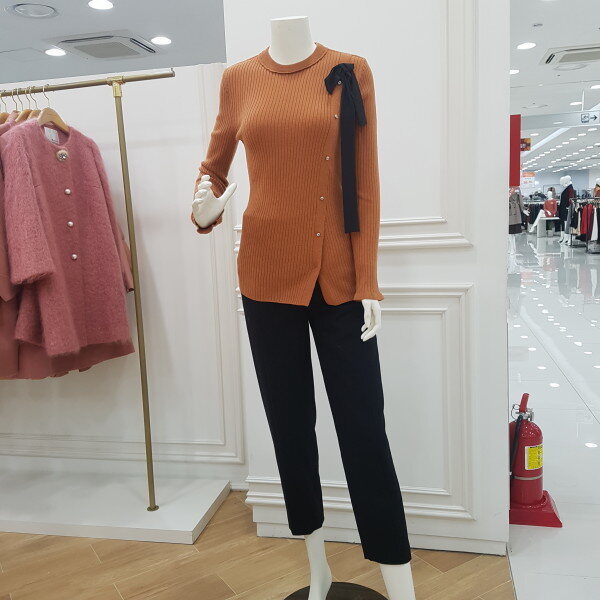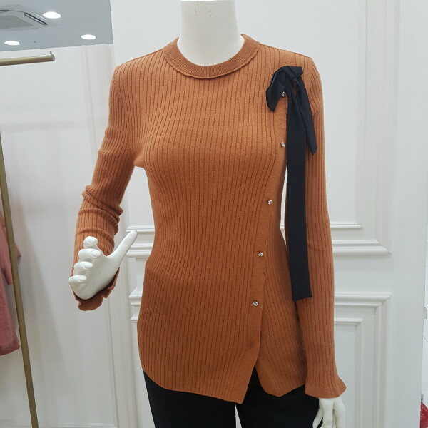 비대칭 여밈의 풀오버로 장식단추와 리본장식이 포인트를 준 니트 입니다.