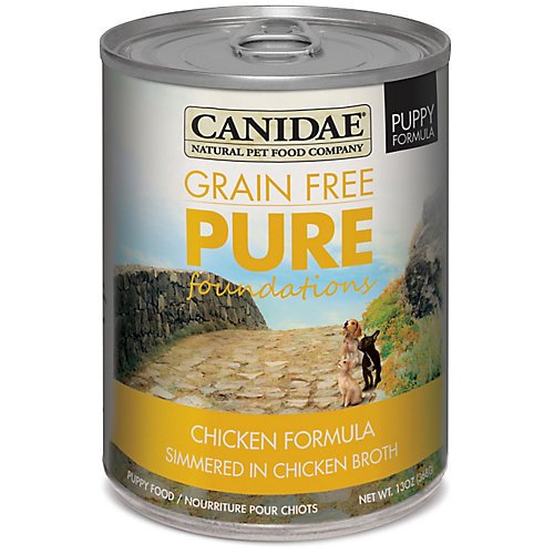 Canidae Grain Free Pure Foundations Can Puppy Food 12 Pack Canidae Grain Free Pure Foundations is formulated to provide quality nutrition for the healthy development of growing puppies. Real chicken is the number one ingredient, providing a great source of high quality protein. Whole foods, including peas and sweet potatoes, are added to round out this gentle digestion and sensitivity recipe. Grain and gluten free, it is an ideal choice for puppies with food sensitivities. This delicious recipe provides a healthy foundation for a long and happy life. Features: Made in the USA For growing puppies Chicken is the #1 ingredient Simple holistic ingredients and whole foods Gentle digestion and sensitivity recipe Grain and gluten free Item Specifications: Size: 13oz can, case of 12 Flavor: Chicken Guaranteed Analysis: Crude Protein: min 9.5% Crude Fat: min 6.5% Crude Fiber: max 1.0% Moisture: max 78.0% Calories: 1,109 kcal/kg, 408 kcal/can Ingredients: Chicken, chicken broth, chicken liver, peas, sweet potatoes, suncured alfalfa meal, salmon oil, tricalcium phosphate, cassia gum, carrageenan, calcium carbonate, guar gum, choline chloride, potassium chloride, minerals (iron proteinate, copper proteinate, manganese proteinate, sodium selenite, calcium iodate), vitamins (vitamin E supplement, thiamine mononitrate, niacin supplement, calcium pantothenate, biotin, vitamin A supplement, riboflavin supplement, vitamin B12 supplement, pyridoxine hydrochloride, vitamin D3 supplement, folic acid) Feeding Instructions: If fed solely to puppies less than 6 months old, feed 3 cans per 25 pounds body weight per day. For puppies 6 months old to maturity, feed 2 cans per 25 pounds body weight per day. Individual puppies will require more or less based on their unique needs and breeds. Fresh water should be available at all times. Canidae Grain Free Pure Foundations is formulated to meet the nutritional levels established by the AAFCO Dog Food Nutrient Profiles for growth.Feature