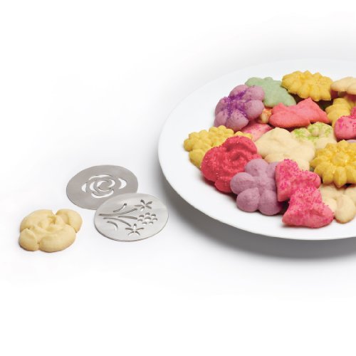 - Feature : Creates consistent cookies every time / Non-slip base keeps Cookie Press steady while dispensing / Clear cylinder shows how much dough is left; Disassembles for easy loading and cleaning / Large, non-slip lever is comfortable for repetitive use / Includes 12 stainless steel cookie disks in different patterns
