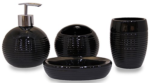-. Brand : JustNile -. Color : Round with Stripes in Black -. EAN : 0712392480147 -. Feature : 4 piece bathroom accessory set / Measures of a set: 20 X 17 X 13cm / The set includes 1 tumbler, 1 toothbrush holder, 1 soap dispenser and 1 soap dish / Adorned with elegant stripes / Made of ceramic -. Label : XianDi -. Manufacturer : XianDi -. MPN : BTHACC200 -. PartNumber : BTHACC200 -. ProductGroup : Home -. ProductTypeName : HOME_BED_AND_BATH -. Publisher : XianDi -. Studio : XianDi -. Title : JustNile 4-Piece Ceramic Bathroom Accessory Set- Round with Stripes in Black -. UPC : 712392480147