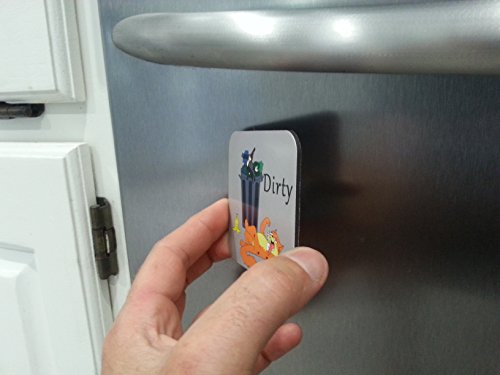 THE PERFECT SIZE 3 x 3 Inches with a Strong Enough Magnet that Will NOT Fall off or Be Annoying yet Still Flip Easy. No Spinning Dials that give Many False readings and cause Confusion. NO Sliding Parts that get Food and Dust Trapped in them. He can also be used to Cover Up that Annoying Ding or Small Dent(or future ding/dent). Now if only we could get him to Clean the Dishes! • PLEASE TEST your dishwasher door with any other magnet to ensure the Dish Kitty can stick(most will stick).