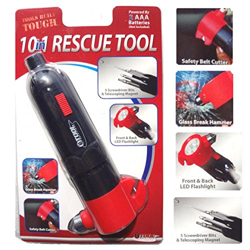- Feature : Order includes two of each: 10 in 1 Rescue Tool / Rescue Tool has 5 screwdriver bits & telescoping magnet; Glass break hammer; safety belt cutter; 2 LED flashlights builtin / Take camping, or for car emergencies & earthquakes / Each car passenger rescue hammer tool requires 2 AAA batteries, not included / Make sure all your cars & family members have this car escape tool in their cars. Get your's while supplies last!