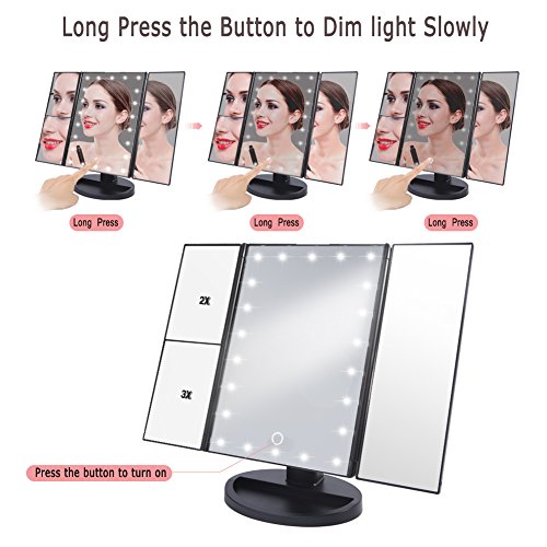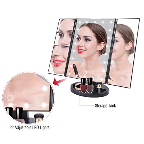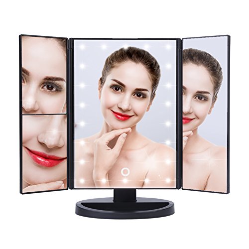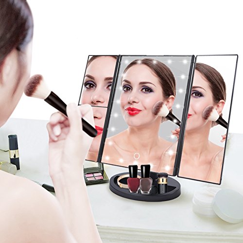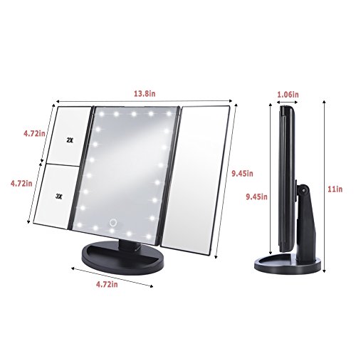 3 Way LED Lighted Vanity Makeup Magnifying Mirror HURRISE Trifold Rectangle Beauty Mirrors with 22 Lights 3x & 2x Magnification for Bedroom Table Desk (White Light)