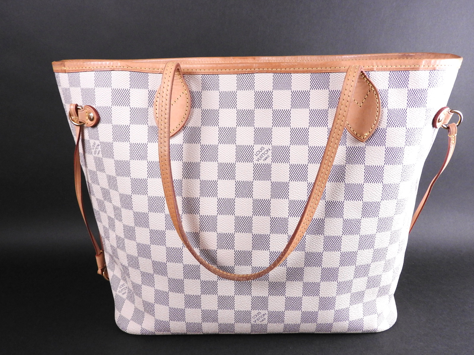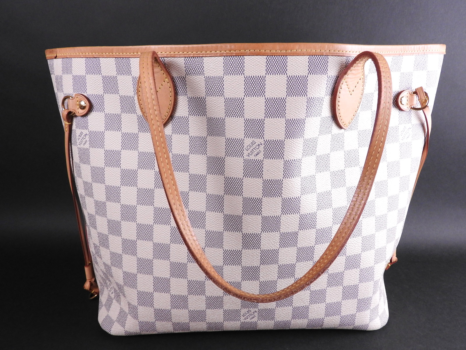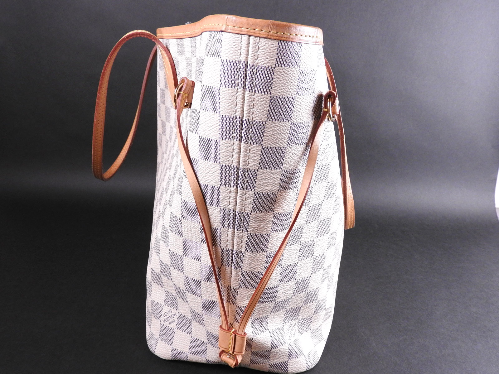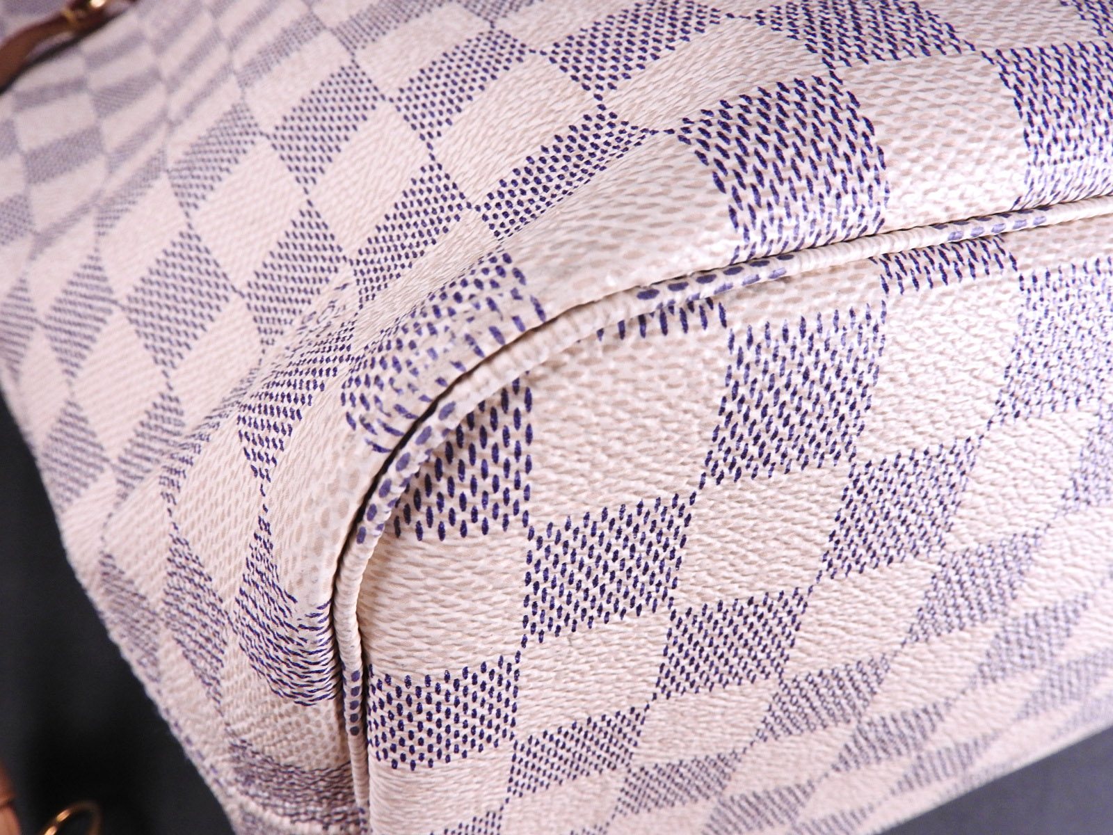 | Exterior | Damier Azur: Barely used feeling. A few slight stains. Leather: Slightly used feeling. Suntanned. Small stains, abrasions and wrinkles in the trim around the top of the bag. |