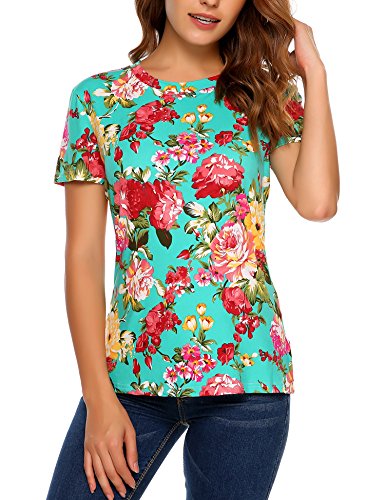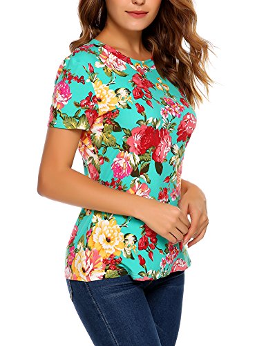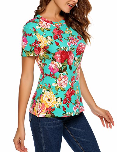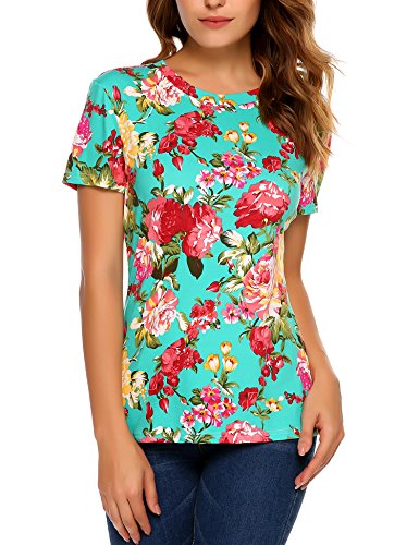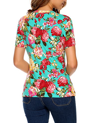 Soteer Women Summer Casual Short Sleeve Floral Printed Blouse Tops Shirts Dark Green S
