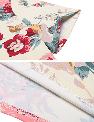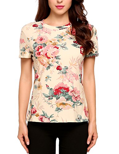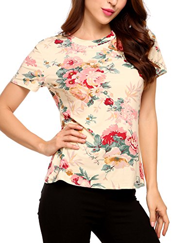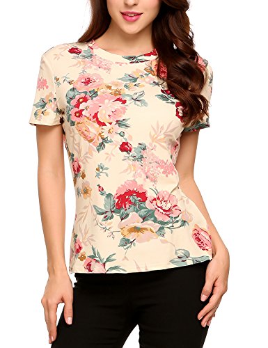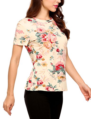 Soteer Women Summer Casual Short Sleeve Floral Printed Blouse Tops Shirts Beige L