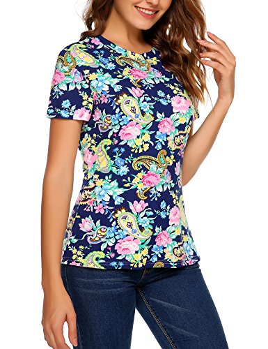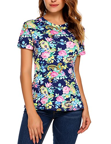 Soteer Women Summer Casual Short Sleeve Floral Printed Blouse Tops Shirts Navy Blue M