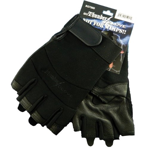 Studio : Global Glove Publisher : Global Glove Binding : Misc. Product Description Global Glove ThunderGlove black deerskin fingerless motorcycle sport glove. Material: flexible spandex over genuine deerskin, rubber knuckle protection, fingerless. Reinforced thumb and palm with added padding. Black spandex two way stretch backing for fit and flexibility. Extra tough knuckle protection. Double genuine deerskin padded palm. Elastic cuff with hook and loop Velcro closure for a perfect fit. Fingerless for superior dexterity. Excellent for most industrial and mechanical applications. Excellent for working with pneumatic tools. Also a great sport glove. Size: medium. 0