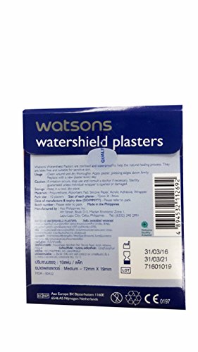 -. Feature : 6 packs of Watsons Watershield Plasters (Medium). Latex free, Sterile, Waterproof. (Size of each plaster: 72mm x 19mm.) (10 plasters/ pack). Materials: Polyurethane, Absorbent Pad, Silicone Paper, Acrylic Adhesive, Wrapper. / Watsons Watershield Plasters are sterised and waterproof to help the natural healing process. They are latex free and suitable for sensitive skin. / Usage: Clean wound and dry thoroughly. Apply plaster, pressing edges down firmly. Replace with a new plaster every day. / Caution: If irritation occurs, stop use consult a doctor if necessary. Sterility guaranteed unless individual wrapper is opened or damaged. Storage: Keep in a cool, dry place. / free!! Tracking number and sticker Thai_product, souvenir from Thai_product., High Quality & Services by Thai_product.