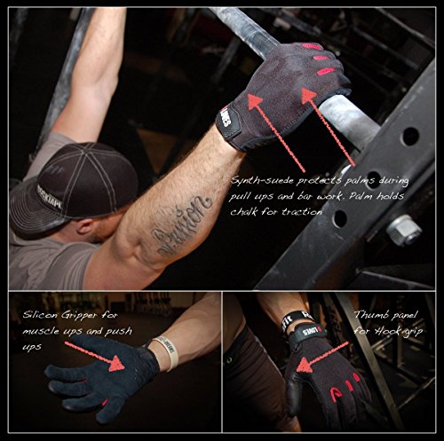 -. Feature : Seamless palm construction / "False-grip" silicon ribs to help with Muscle Ups / Hook grip thumb protection / Vented finger side walls / Works with Chalk