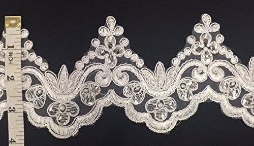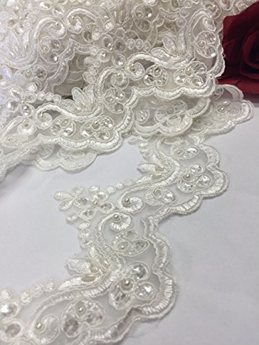 2 Yards, Bridal Lace Trim on Organza, Pearls and Clear Sequins, for Veil, Wedding Dresses, Garments, Ivory, 4" Inches