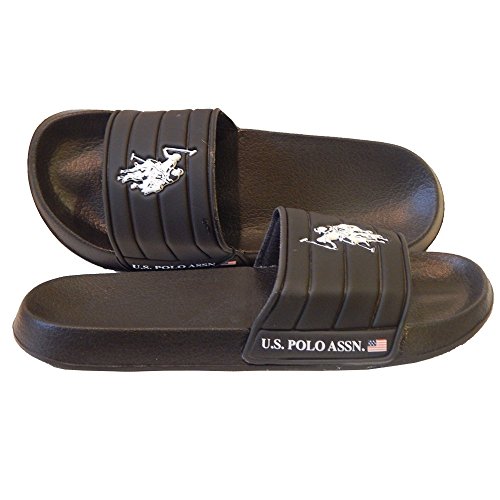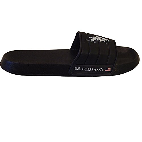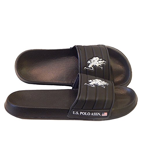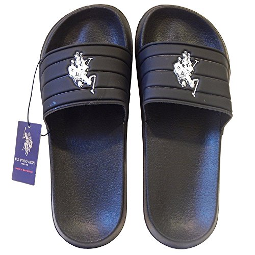 -. Binding : Apparel -. Brand : U.S. Polo Assn. -. Color : Sport -. Department : unisex-adult -. Feature : Authentic U.S. Polo Assn. Since 1890. Logo-accented slide sandal flip-flop. / Laid-back comfort flip flop with wide slide upper with iconic US Polo Assn logo on the upper. Wet or dry this athletic sandal will be comfortable all day long! / Contoured and flexible for comfort. Traction outsole. Comfortable and easy to wear. / Manmade Material. Beach-ready sandal, U.S. Polo Assn. iconic logo printed on the upper, U.S. Polo Assn. and American Flag on the side of the sole, in light navy.. -. ProductGroup : Shoes -. ProductTypeName : SHOES -. Size : Large -. Title : U.S. Polo Assn. Men's Premium Contoured Footbed Slide Sandal Flip Flop