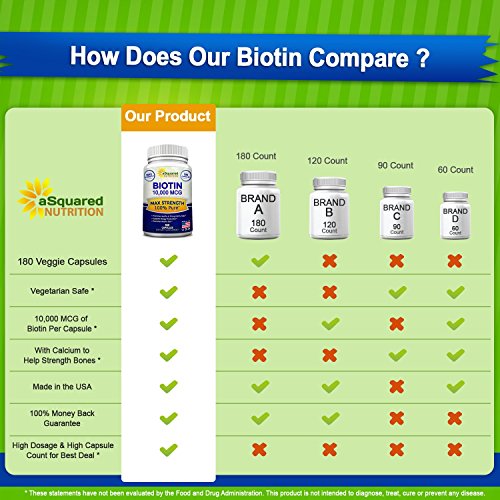 BEST VALUE AVAILABLE ON AMAZON: Our Biotin product is manufactured in the USA in an FDA registered and GMP certified facility, and is subject to stringent quality testing. Backed by our 100% MONEY BACK GUARANTEE for 30 days, you receive 180 Capsules - not to be mistaken for liquid softgels , biotin powder , serum , gummies , chewable chews , sublingual drops , dots , dissolve tablets , time release lozenges , coconut oil , injection , patch , essential oil , drink , gel , serum , spray & gel *