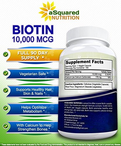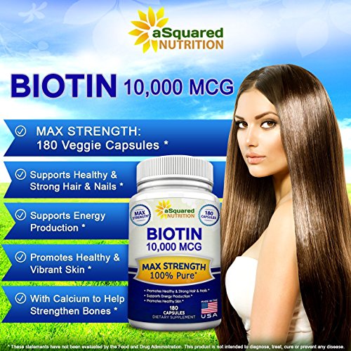 MAXIMUM STRENGTH BIOTIN: Each bottle contains 180 Veggie Capsules, and each capsule is packed with 10,000 MCG of Biotin (vitamin B7), which is one of the B-complex vitamins, and is also known as Vitamin B7. As an added bonus, our unique formula includes 176 MG of Calcium per capsule to help strengthen bones. *