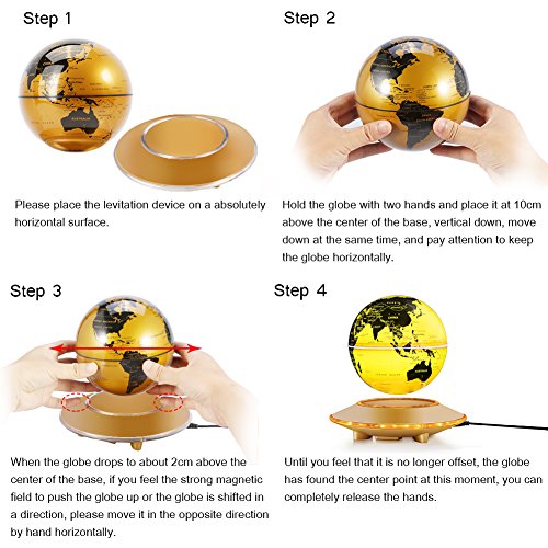 Warm Tips: 1. Don't unplug the power adapter without remove the globe first, or the globe will pound the base. 2. Powerful magnet! Please keep this item at least 20cm away from computer devices and other electronic devices and metal. 3. When the globe rotates too fast or appears a beating phenomenon, please reposition the globe. Otherwise, the base overheat, and the device will produce over-current protection, automatic power off. Over heat will shorten the service life.