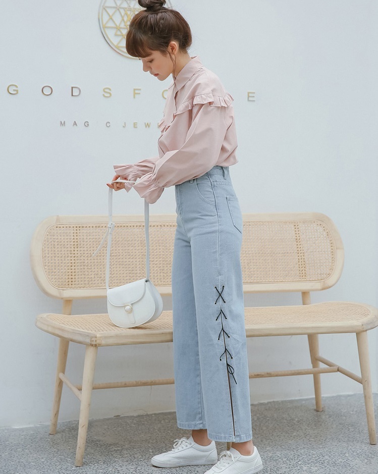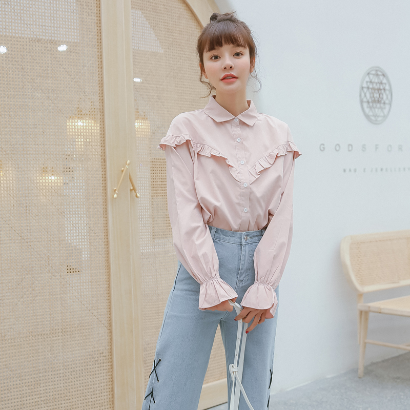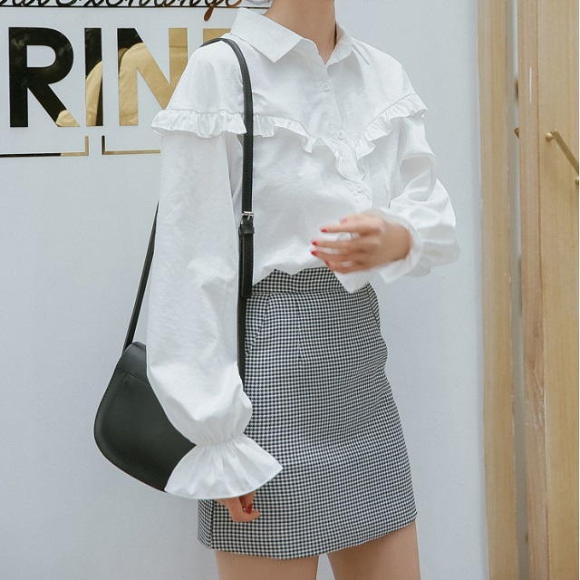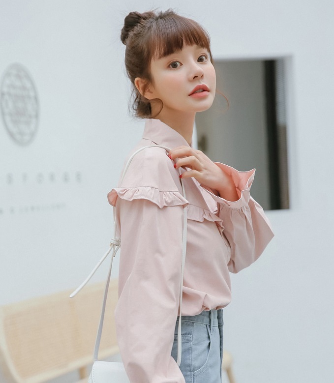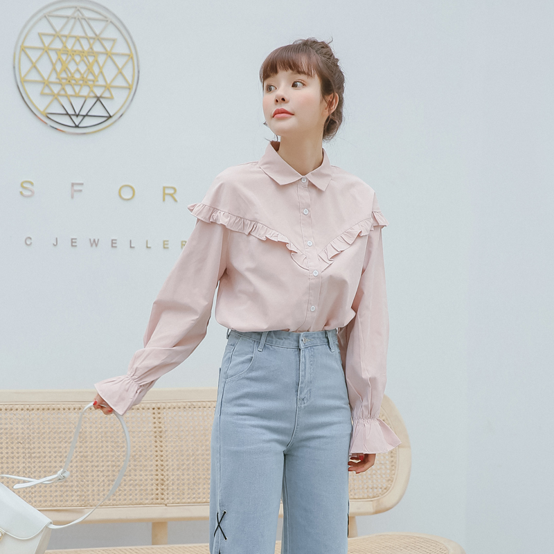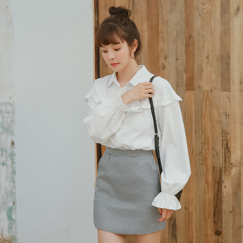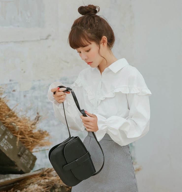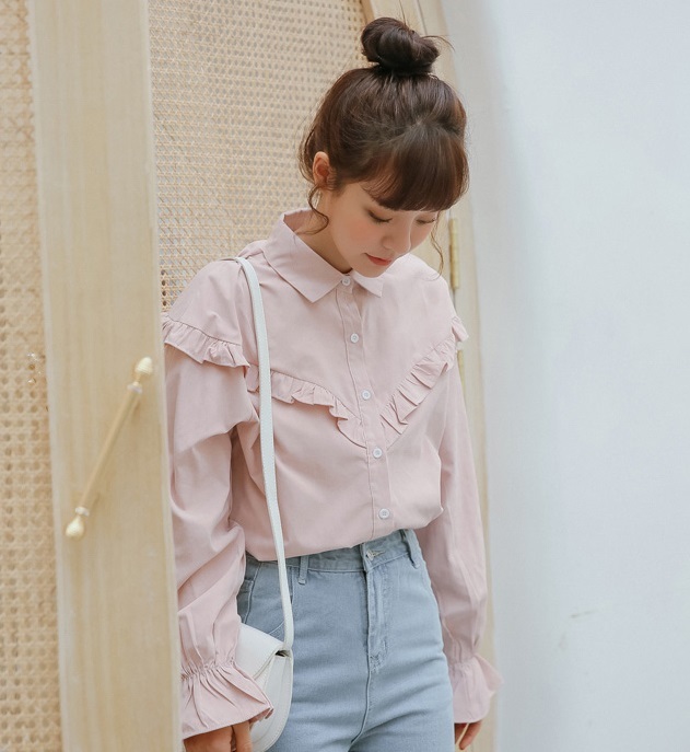 フロント~バックにかけてライン上にあしらったプチフリルがポイントのブラウスです☆