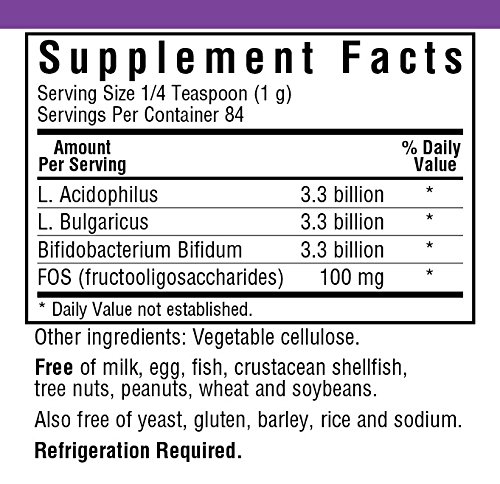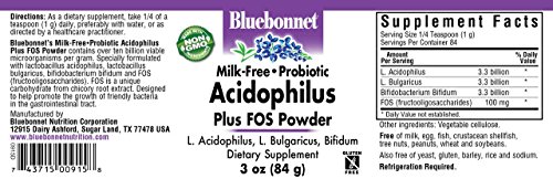 Bluebonnet's Milk-Free Probiotic Acidophilus Plus FOS Powder provides over ten billion viable, healthy microorganisms per gram. This probiotic formula is specially formulated with lactobacillus acidophilus (3.3 billion), lactobacillus bulgaricus (3.3 billion), and bifidobacterium (bifidum and longum, 3.3 billion) in a unique 100 mg base of FOS (fructooligosaccharides). FOS is a unique carbohydrate from Jerusalem Artichoke flour. Designed to help promote the growth of friendly bacteria in the gastrointestinal tract. Available in easy-to-mix powder for maximum assimilation and absorption.Feature