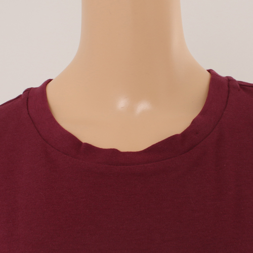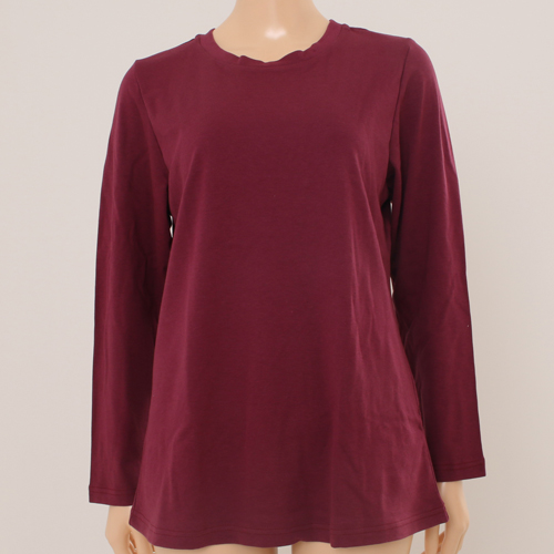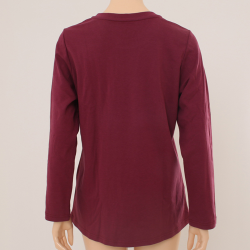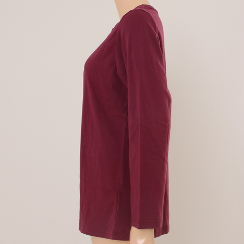 와인 칼라의 솔리드 상의로 원단이 도톰하고 보온성 이 뛰어나고 촉감이 부드러운 라운지웨어. 베이직한 티 셔츠 디자인으로 뒷목안에 손바이어스로 편안함 및 포인 트를 주었으며 겨울철 편안하게 착용할 수 있는 라운지 웨어 제품.