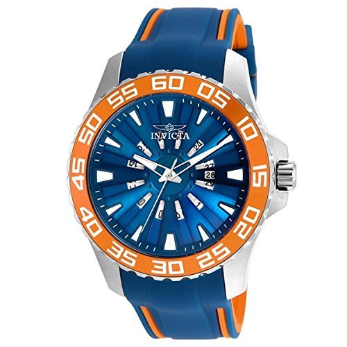 Invicta 25475 Pro Diver men's watch features a 48mm wide solid stainless steel case with a fixed orange aluminum accented bezel and textured push-pull crown. Invicta 25475 is powered by Japanese TMI PC32 quartz movement. This stylish watch also features a textured shiny sunray blue dial with white accents silver tone luminous skeleton hands and index hour markers along with the date display function, scratch resistant flame fusion crystal and water resistant to 100 meters. Invicta 25475 is equipped with a 24mm wide blue and orange polyurethane rubber strap with a buckle clasp. Invicta 25475 men's Pro Diver blue dial blue & orange polyurethane strap watch is brand new and comes in an original Invicta gift box and is backed by a 5 year limited warranty.Feature