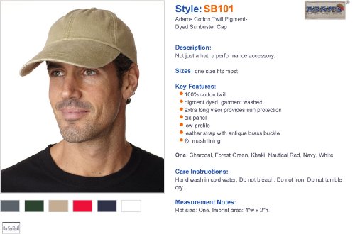 Studio : Adams Cap Publisher : Adams Cap Binding : Apparel Product Description Adams Cap Cotton Twill Pigment-Dyed Sunbuster Cap Baseball Cap: Not just a hat, a performance accessory; 100% cotton twill; pigment dyed, garment washed; extra long visor provides sun protection; six panel; low-profile; leather strap with antique brass buckle; Adams' exclusive Cool-Crown mesh lining; Size: one size fits most. Care: Hand wash in cold water. Do not bleach. Do not iron. Do not tumble dry. 0