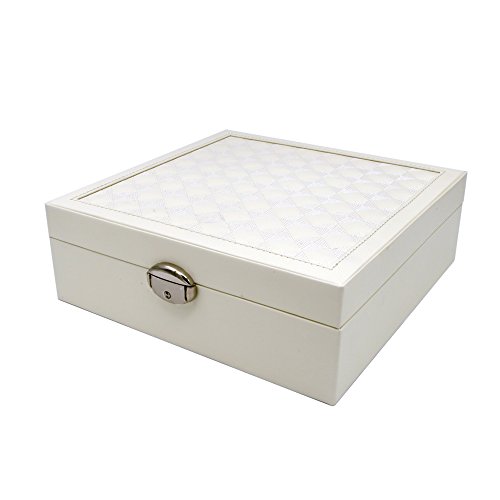 - The compartments hold necklaces, bracelets, rings, earrings, etc.Soft faux leather exterior, with a cushiony velvet interior, checker board pattern on the top with the different textured squares bring attractive appearance and durable quality.