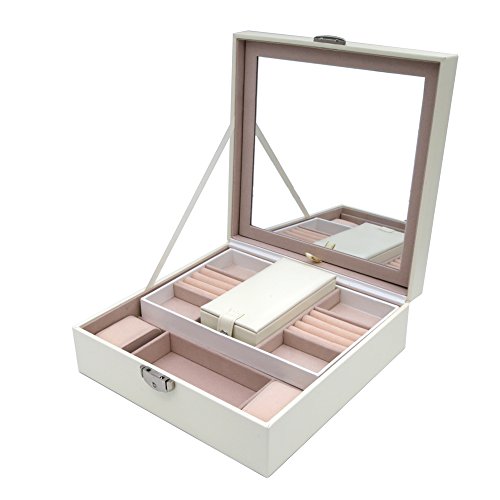 KLOUD City Jewelry Box - Classic Jewelry Organizer , Large Mirror & 2 Trays for Women Teens and Girls - Holder for Earring Ring Necklace Bracelet -PU Leather (white)