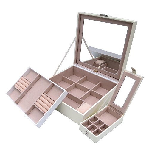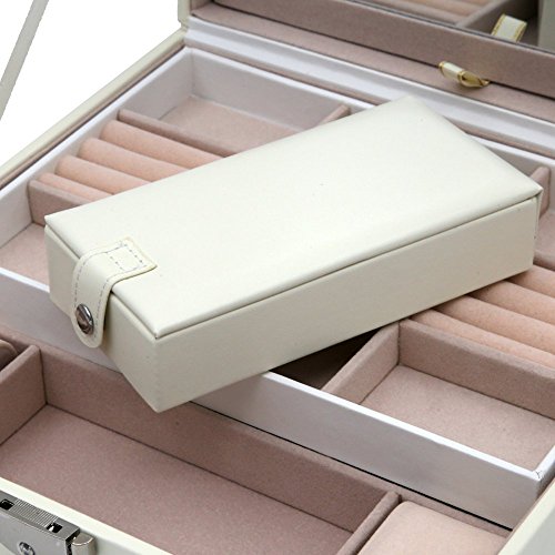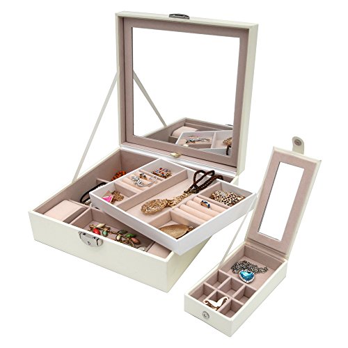 - Smart removable travel size jewelry tray for short trips with snap button closure,the whole case does have a locking latch and even includes a key that adds security. Both little travel box and the big one have mirrors,pulled forward and leaned against the front of the jewelry box,great for applying makeup and dressing up.