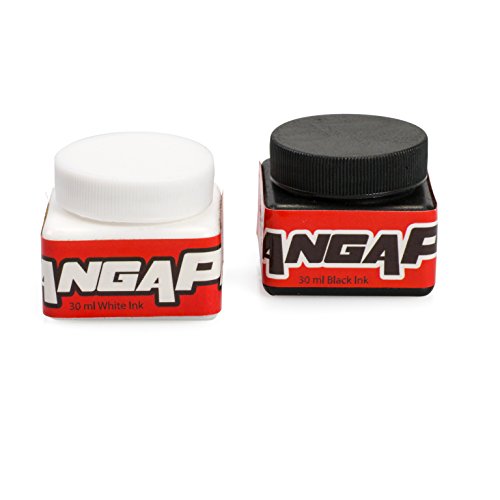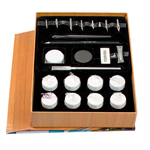 - 24 piece set includes black ink well, white ink well, 8 liquid watercolors, paper cutting knife, paper cutting blades, pen nibs, pen nib holder, eraser, and pencil