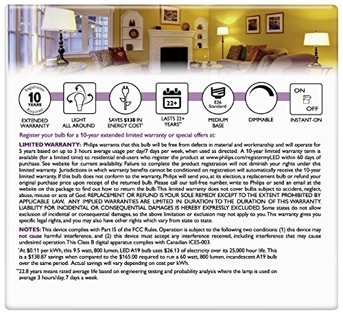 The Philips 60 watt equivalent household A19 LED bulb allows you to experience smooth dimming from 2700K to 2200K. This bulb is ideal for household use in living rooms, dining rooms and bedrooms. You'll have the flexibility to create the right lighting level and ambiance with dimming all the way down to 10% of full light output. This Philips LED bulb uses a smaller, translucent housing for a clean, traditional look making it a perfect Replacement for any household fixture. The bulb contains no mercury and comes with a 5 year warranty, extendable to 10 years.Feature
