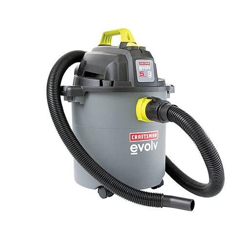 Clean It Up Fast with the Craftsman EVOLV 5 Gal. Wet/Dry Vac From the boat to the car to the house, this Craftsman EVOLV 5 gal. 3 peak HP wet/dry vac will make quick work of the aftermath once the fun is over. Its powerful 3.0 peak HP motor gives you the suction you need to remove tough dirt from upholstery or to clean the sawdust off the floor in a snap. It has a selection of accessories, including three extension wands and a squeegee nozzle, that ensure that you have the right tool for any job. The accessories all store on board so that you'll always know where they are, too. The Craftsman EVOLV 5 gal. wet/dry vac has an eight-foot cord that lets you navigate easily, as well as a six-foot hose that extends your reach even further. It rolls easily on its four casters across most any floor or surface. It's blower capable, with a large on-off switch that you'll never struggle to see. The vac comes with everything you need to get going, including a foam sleeve and reusable filter. This Craftsman EVOLV 5 gal. 3 peak HP wet/dry vac can make quick work of your messes, from a dirty car to muddy floor The vacuum's tank is made of durable polypropylene The 8-ft cord gives you room to work Casters roll across any surface Convenient on-board storage for accessories Blower capable Comes with a 6' by 1.25" secure-fit hose; 3 extension wands; and a 10" floor/squeegee nozzle Also comes with a foam sleeve and reusable cloth filterFeature
