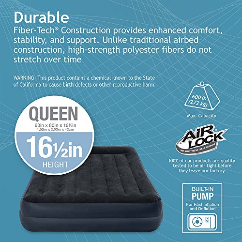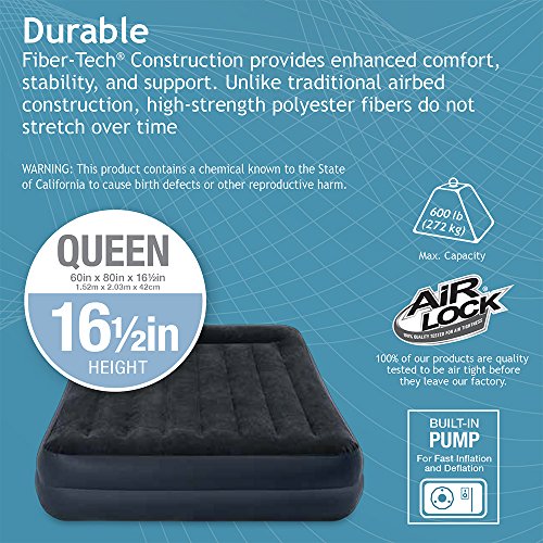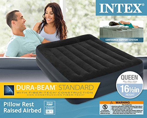 Studio : Intex Recreation Corp. (Import) Publisher : Intex Recreation Corp. (Import) Binding : Sports Product Description Part of the new dura-beam standard series of airbeds, the pillow rest raised airbed now features an interior made with Intex innovative fiber-tech construction which is comprised of thousands of high-strength polyester fibers that provide enhanced comfort, stability and support. With its luxuriously soft, flocked top, this queen airbed is an amazing solution for overnight guests. The built-in electric pump plugs right into your standard wall outlet and inflates the bed in about 3 minutes so there is no need to rummage through the garage for your old electric pump or fuss with tiring hand or foot pumps. Plus, you don't have to break out extra pillows since it features a built-in pillow rest as well. 0