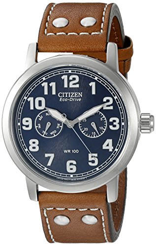Feature : Vintage-inspired watch featuring blue dial with luminous Arabic markers and dual subdials / 43 mm stainless steel case with mineral dial window / Japanese quartz movement with analog display / leather calfskin band with buckle closure / Water resistant to 100 m (330 ft): In general, suitable for swimming and snorkeling, but not scuba diving