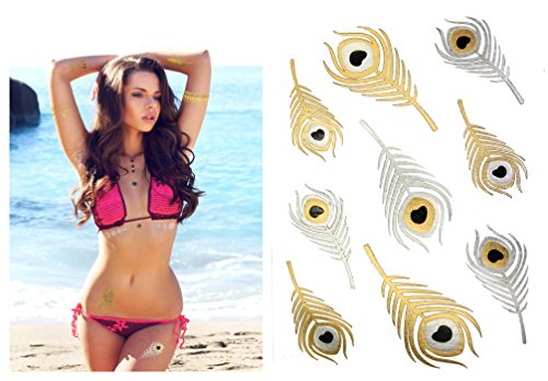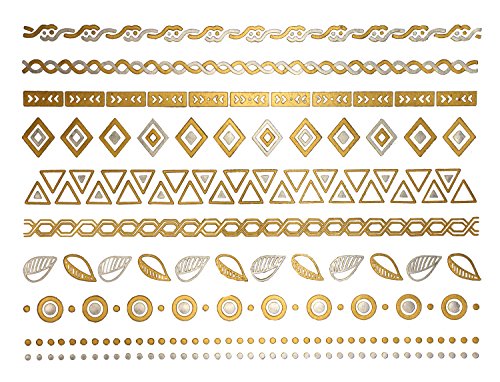 6 X sheets of the latest fake jewelry tattoos. Over 75+ vibrant foil tattoo designs in gold, silver and black. Designs include a dreamcatcher, doves, arrows, peacock feathers, tribal bracelets, armbands and wristbands, rings, links, and shells.