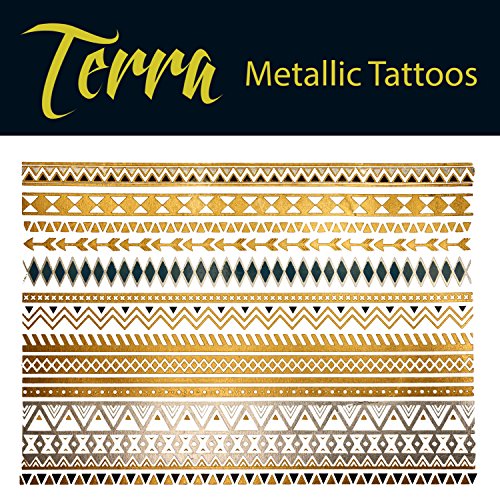 Terra metallic tattoos are glamorous and fun - easily customize your own unique style! Apply our shimmer temporary tattoos anywhere on your body: ankle, wrist, back, chest, arm, nails, shoulder, forearm, hands and more.