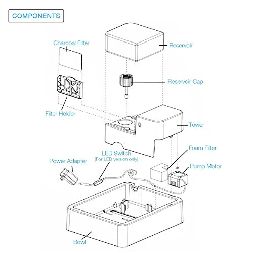 Features: Fresher, better tasting filter water Encourages your cat to drink more Health and hygiene promotion for your pet 65-ounce large water capacity design Easy disassembly for cleaning Noise-cancelling automatical water dispensing Low energy consumption: approx. 1.5 KWh monthly, 18KWh yearly