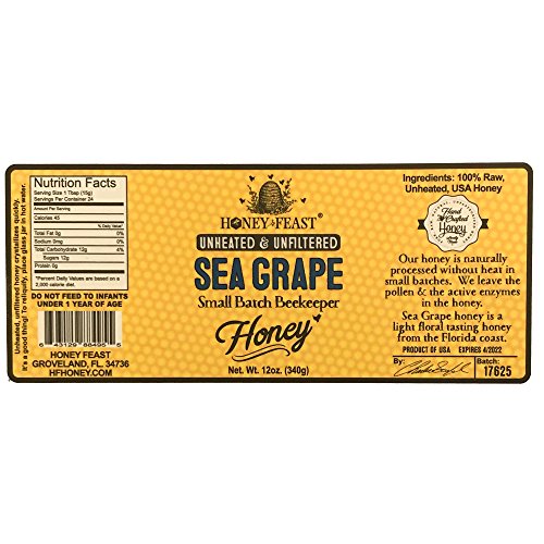 -. Binding : Misc. -. Brand : Honey Feast -. EAN : 0643129884955 -. Feature : Gourmet Sea Grape Honey from the ocean areas & islands of Florida. Amazingly floral and distinct. / More than just Raw and Unfiltered! This honey is also UNHEATED and COLD PACKED preserving enzymes. / 100% USA Honey from Florida. Hand Crafted and bottled right from the barrel in Small Batches. / No processing equipment! Just a 200 millimeter screen to allow maximum hive particles in the honey / GOURMET GLASS JAR. ADD A HONEY PUMP TO YOUR ORDER TO PUMP OUT OF THE JAR. Beautiful look in kitchen -. IsAdultProduct : 0 -. Label : Honey Feast -. LegalDisclaimer : Do not feed to infants under 1 year of age -. Manufacturer : Honey Feast -. NumberOfItems : 1 -. PackageQuantity : 1 -. ProductGroup : Grocery -. ProductTypeName : GROCERY -. Publisher : Honey Feast -. Size : 12 ounces -. Studio : Honey Feast -. Title : Gourmet Sea Grape Honey - 12oz Glass Jar. Raw, Unheated, Unfiltered USA Honey Feast brand honey. Hand crafted small batch beekeeper honey from Florida. USA Honey. -. UPC : 643129884955