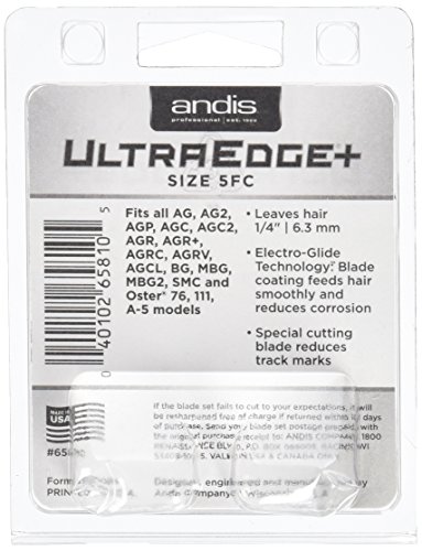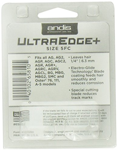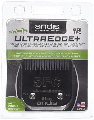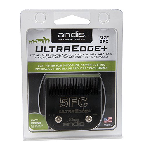Studio : Andis Publisher : Andis Binding : Misc. Product Description The Andis UltraEdge No.5 Finish Cut (FC) Blade features an Electro-Glide Technology (EGT) charcoal colored finish, which allows the blades to cut smoother and faster, as well as resists rust. The upper blade is engineered to require fewer passes through the hair saving time and money when used properly as a final step in the grooming process. Fits all Andis AG, AGC, AGR and MBG Models, Oster A-5 and most detachable-type clippers. Leaves hair 1/4" or 6.3 mm. The Electro-Glide Technology (EGT) Finish smoothes out natural imperfections found on metals. The finish bonds to the metal surface and the smoother finish delivers less resistance while grooming. This means the coat of hair will smoothly feed through the blade for a faster cut. Working in conjunction with our specially designed tooth patterns makes for exceptionally smooth-cutting blades. 0