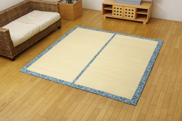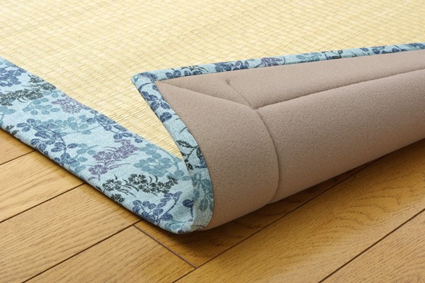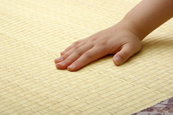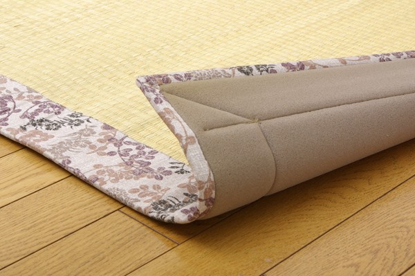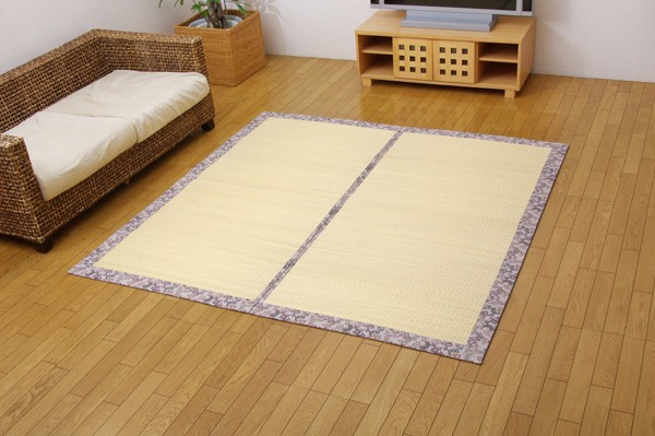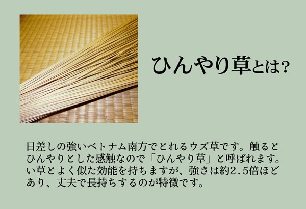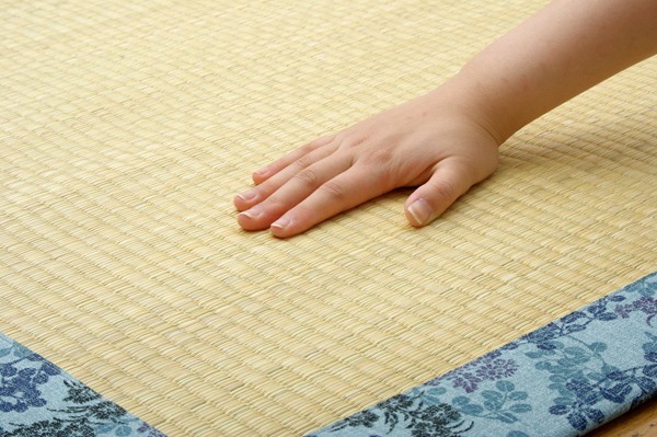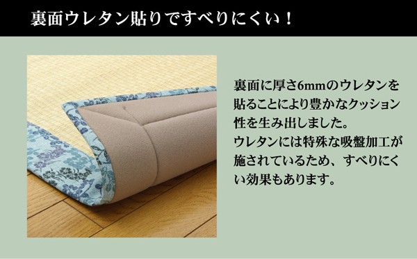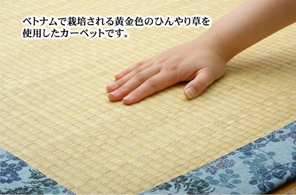 ひんやり冷たい自然素材、「うず草」を使用したラグカーペットです。ベトナム南方でとれるうず草を赤道直下のもと乾燥させ、きれいな黄金色に仕上げました。日本のい草によく似た特徴がありますが、特に…(1)ひんやり冷たく、夏に最適。(2)表面が強く、使えば使う程光沢が出る。(3)い草の約2.5倍の強さがある。(4)ホルムアルデヒドを吸着する、等が挙げられます。裏には滑り止め効果と、適度なクッション性を持たせる為にウレタンを貼っています。