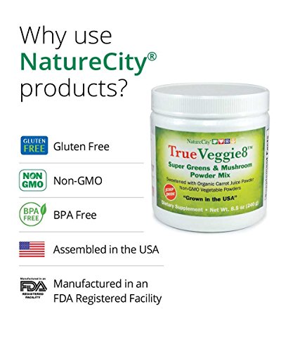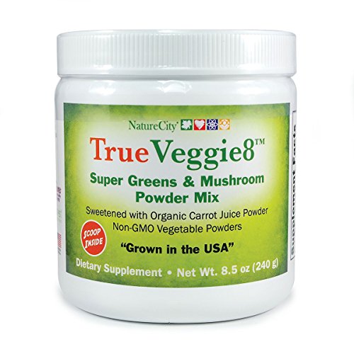 -. Binding : Health and Beauty -. Brand : NatureCity -. Feature : • TrueVeggie8TM combines eight potent vegetable super foods into an energizing and detoxing drink powder mix. And all of these are "Grown in the USA." / • The vegetable powders in TrueVeggie8TM were chosen because they are nutritionally dense, organically grown and Non GMO, while being low in unwanted substances like heavy metals. / • Super greens include Non GMO California Grown Spirulina, Organic Wheat Grass and Organic Alfalfa (both from PINES International in Kansas). / • TrueVeggie8TM contains four unique mushrooms powders called Organic MycoFusions® (Cordyceps/Maitake/Shitake/Reishi) which are grown on anthocyanin rich purple corn in California and adds to the potency of the mushrooms. / • Oregon sourced organic carrot juice powder from Vibrant HarvestTM provides natural sweetness No other sweeteners or flavors are added. -. IsAdultProduct : 0 -. Label : NatureCity -. Manufacturer : NatureCity -. MPN : VEG030 -. PackageQuantity : 1 -. PartNumber : VEG030 -. ProductGroup : Health and Beauty -. ProductTypeName : HEALTH_PERSONAL_CARE -. Publisher : NatureCity -. Studio : NatureCity -. Title : TrueVeggie8 Super Green & Mushroom Powder Drink Mix All USA Grown Non GMO - 30 Servings