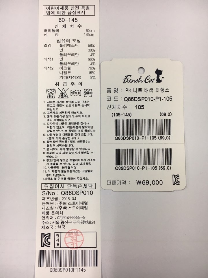 제품소재 : 겉감: 폴리에스터58% 면38%폴리우레탄4%배색1: 면96% 폴리우레탄4%배색2: 아크릴76% 나일론16% 기타(지정외)8%