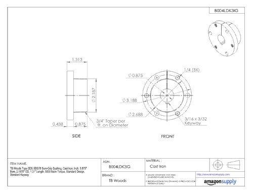 TB Woods Type SDS SDS78 Sure-Grip Bushing, Cast Iron, Inch, 0.875" Bore, 2.1875" OD, 1.31" Length, 5000 lbs/in Torque, Standard Design, Standard Keyway