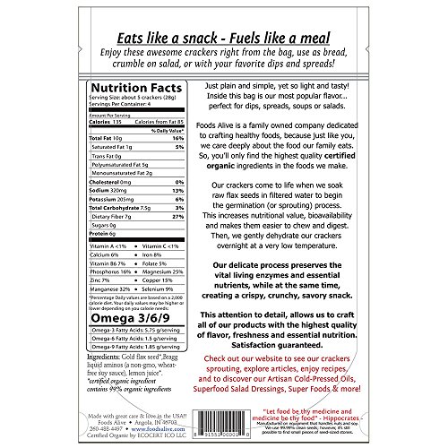 -. Feature : Nature's Perfect Health FoodEnjoy these flax crackers right from the bag, on salads, as bread, or with your favorite dips & spreads!Foods Alive is a family-owned company dedicated to creating the healthiest food / Foods Alive