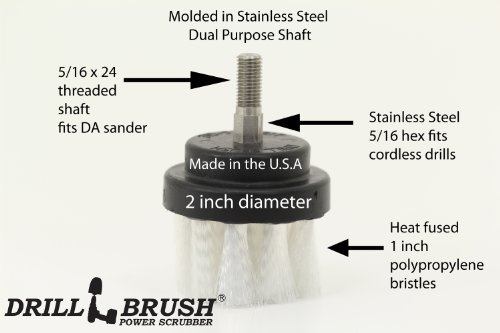 -. Binding : Office Product -. Brand : Drillbrush -. Color : White -. EAN : 0700814144968 -. Feature : 2 inch diameter brush with durable fused in nylon soft bristles. Part Number: 2 inch White 1 in bristle / Stainless Steel dual purpose shaft fits most cordless drills and is threaded (5/16 x 24) for use with DA Sanders and professional cleaning machines / Small design allows for access to tight areas and hard to reach spaces / Soft bristle design for scratch free cleaning and gentle scrubbing / Made in the U.S.A. -. Label : Drillbrush -. Manufacturer : Drillbrush -. Model : 2 inch White 1 in bristle -. MPN : 2 inch White 1 in bristle -. PackageQuantity : 1 -. PartNumber : 2 inch White 1 in bristle -. ProductGroup : Office Product -. ProductTypeName : OFFICE_PRODUCTS -. Publisher : Drillbrush -. Studio : Drillbrush -. Title : Soft Bristle Small Cleaning Scrub Brush for Upholstery and Carpet -. UPC : 700814144968 -. Warranty : 100% warranted for quality