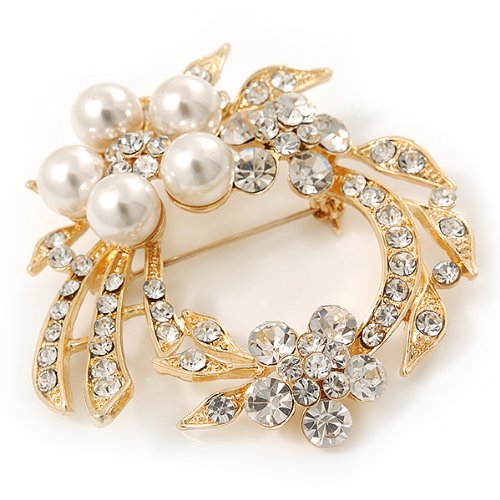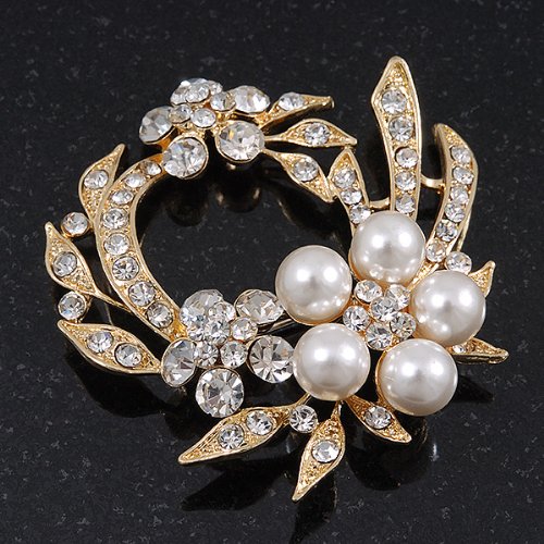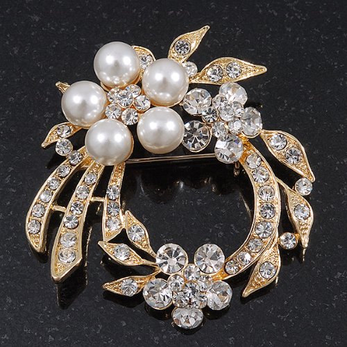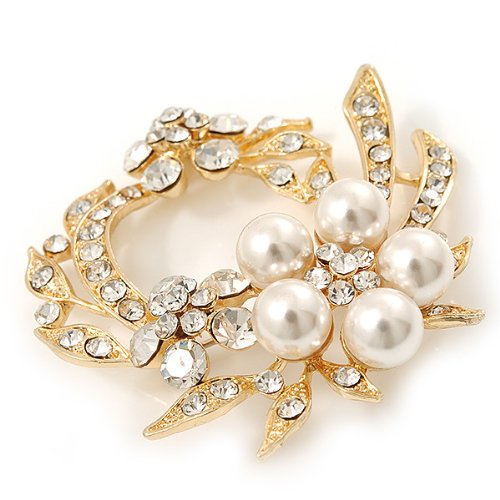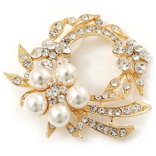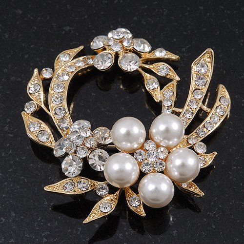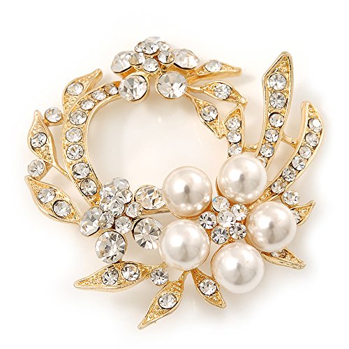 -. Title : White Synthetic Pearl/ Clear Crystal Wreath Brooch In Gold Plating - 5cm Diameter