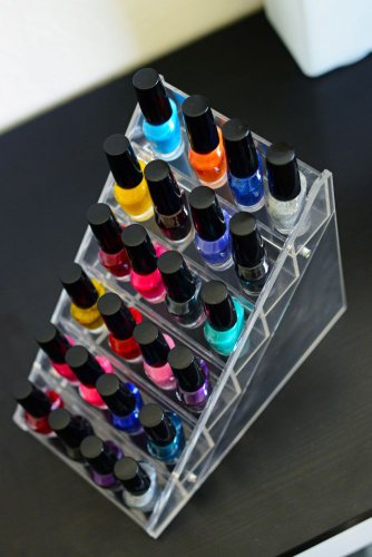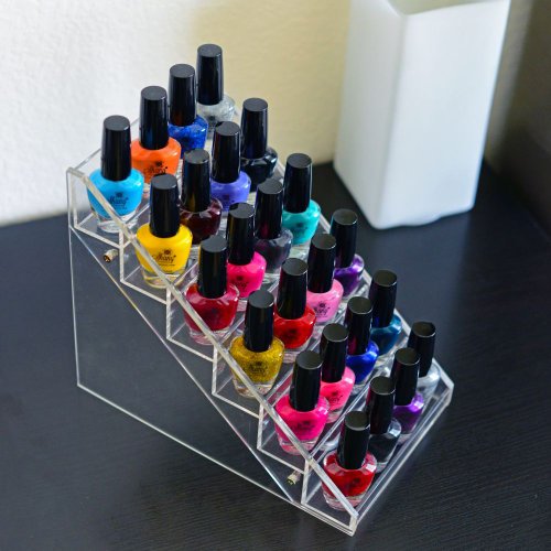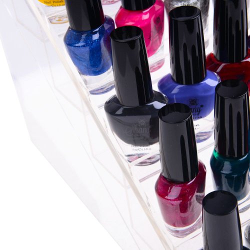 - Feature : Mainly designed for Nail art polishes, or small cosmetics including Mascara, Lipsticks, Lip-glosses and more / The crystal-clear design and the incline surface provides easy access and visibility of your favorite colors. / Solid construction and sturdy base. Will hold most sizes and shapes of tube lipsticks and lip moisturizers. / Used as Nail polish rack, Nail polish organizer, Cosmetics organizers, Lipstick holder, Nail art organizer / Dimensions 5.5L 4W X 2.5H (inches) - 24 Inclined Slots - Each Slot is 7/8" x 7/8" , will fit all Small Nail art Polishes